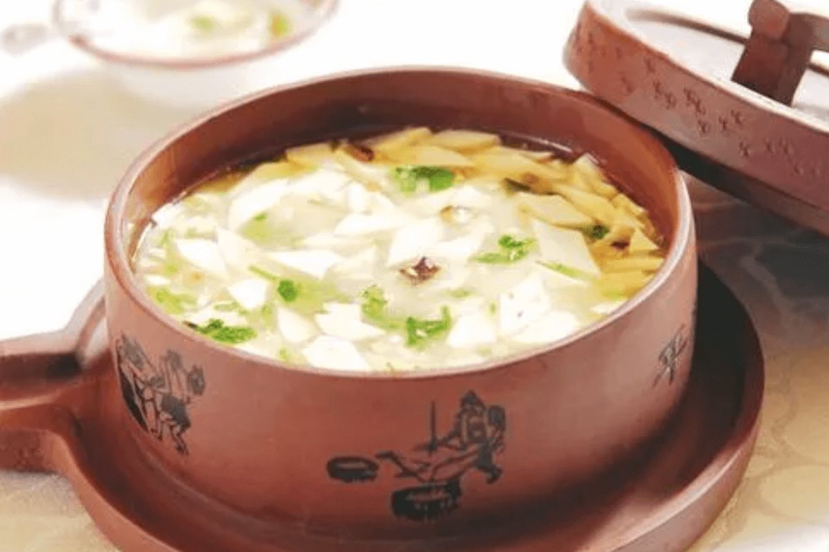 平橋豆腐選用內(nèi)脂豆腐,將其切成一致的菱形小塊,配以雞肉丁、香菇丁、香菜沫,用鯽魚(yú)腦起鮮,美味可口,食而不膩,清素入肺。