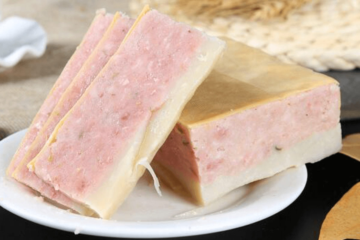 膘雞又叫酥雞,用肥膘肉糊和熟山藥糊等加佐料后拌勻作為表層,用瘦豬肉糊、雞蛋黃等加佐料后拌勻作為底層,紅白相間,質(zhì)地柔韌,不肥不膩。
