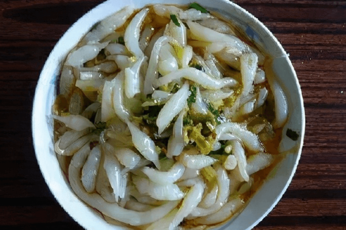 雙堆面魚并不是魚。因為撥到鍋里的一個個面魚兒十分均勻,樣子都是一頭尖,確有幾分像小魚兒,所以人們以其形似,便把這種面食稱作“面魚”。